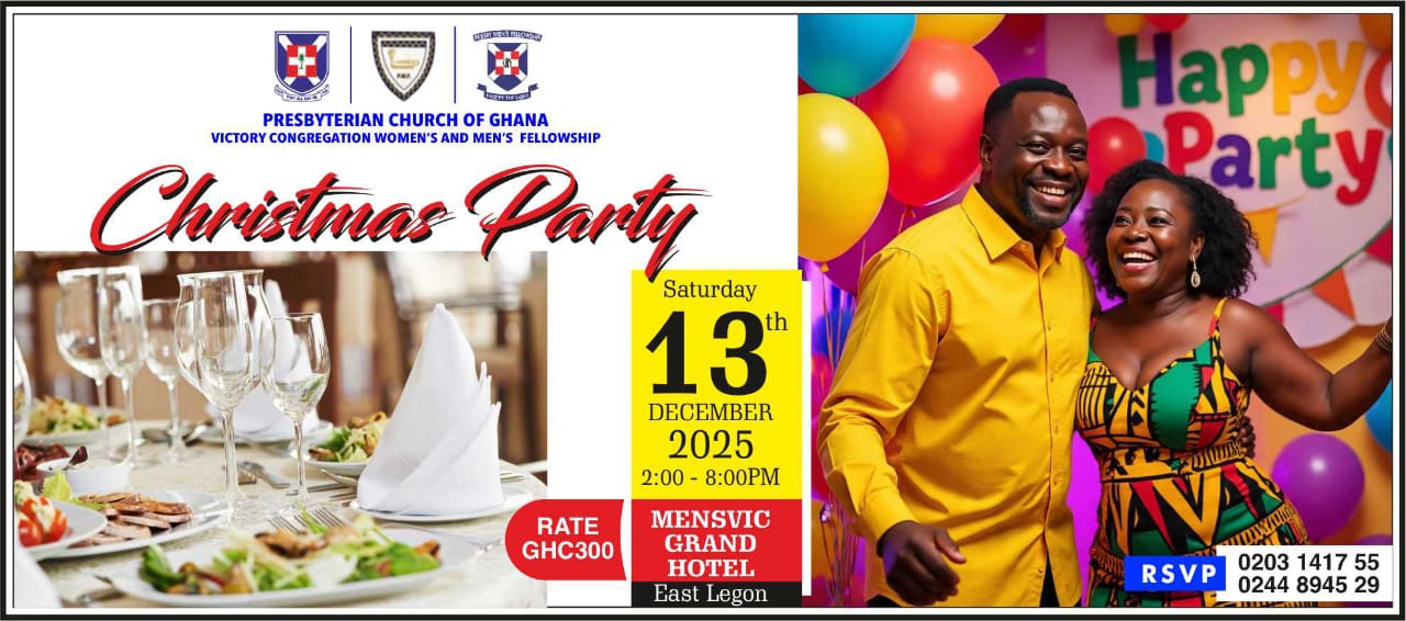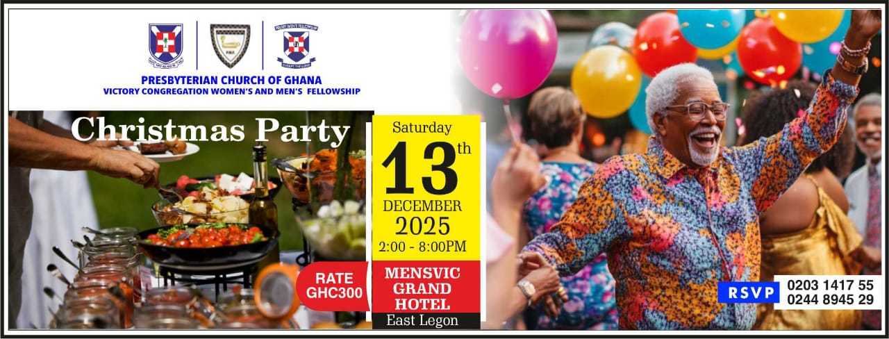 Programmes Christmas Party – 13 Dec. 2025 Date: 13/12/2025 Time: 2:00 pm Venue: Mensvic Grand Hotel - East Legon Host: Women's Fellowship Christmas Party – 13 Dec. 2025 Date: 13/12/2025 Time: 2:00 pm Venue: Mensvic Grand Hotel - East Legon Host: Women's Fellowship